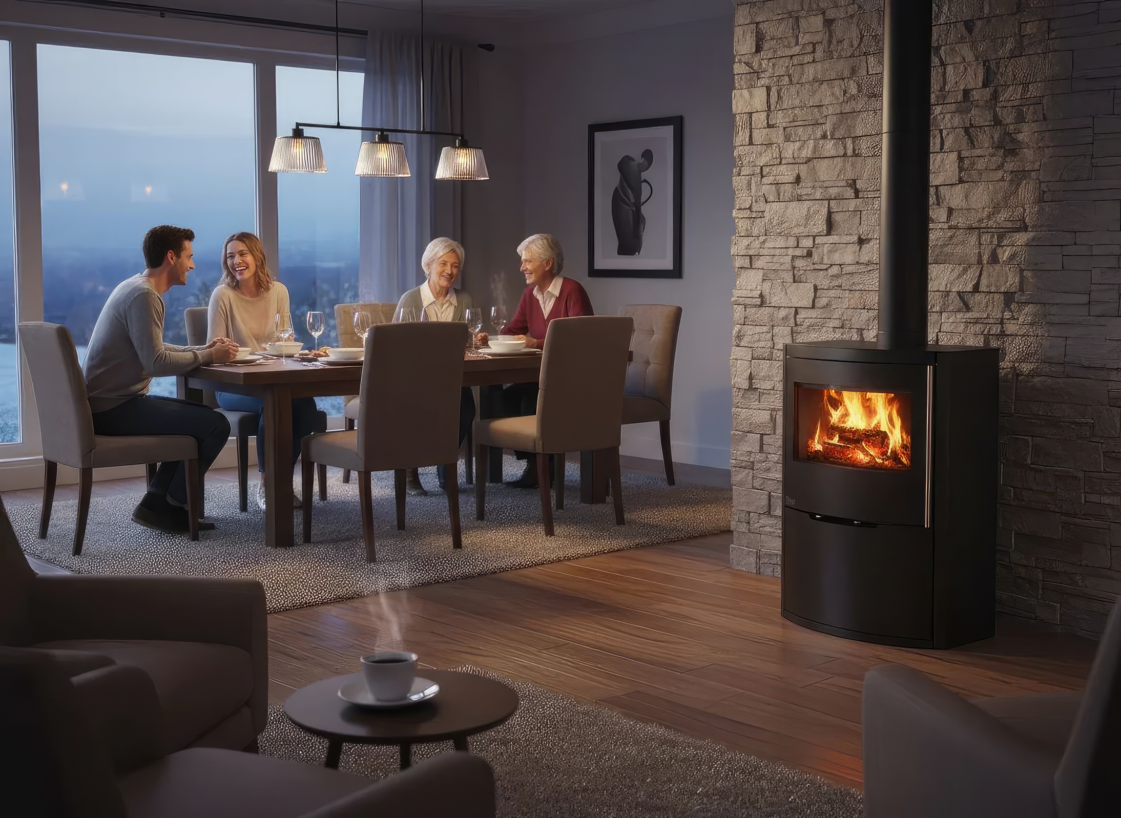 - Остекление Full Glass: Панорамное стекло с черной шелкографией визуально расширяет границы огня, скрывая раму дверцы и подчеркивая премиальный статус устройства.