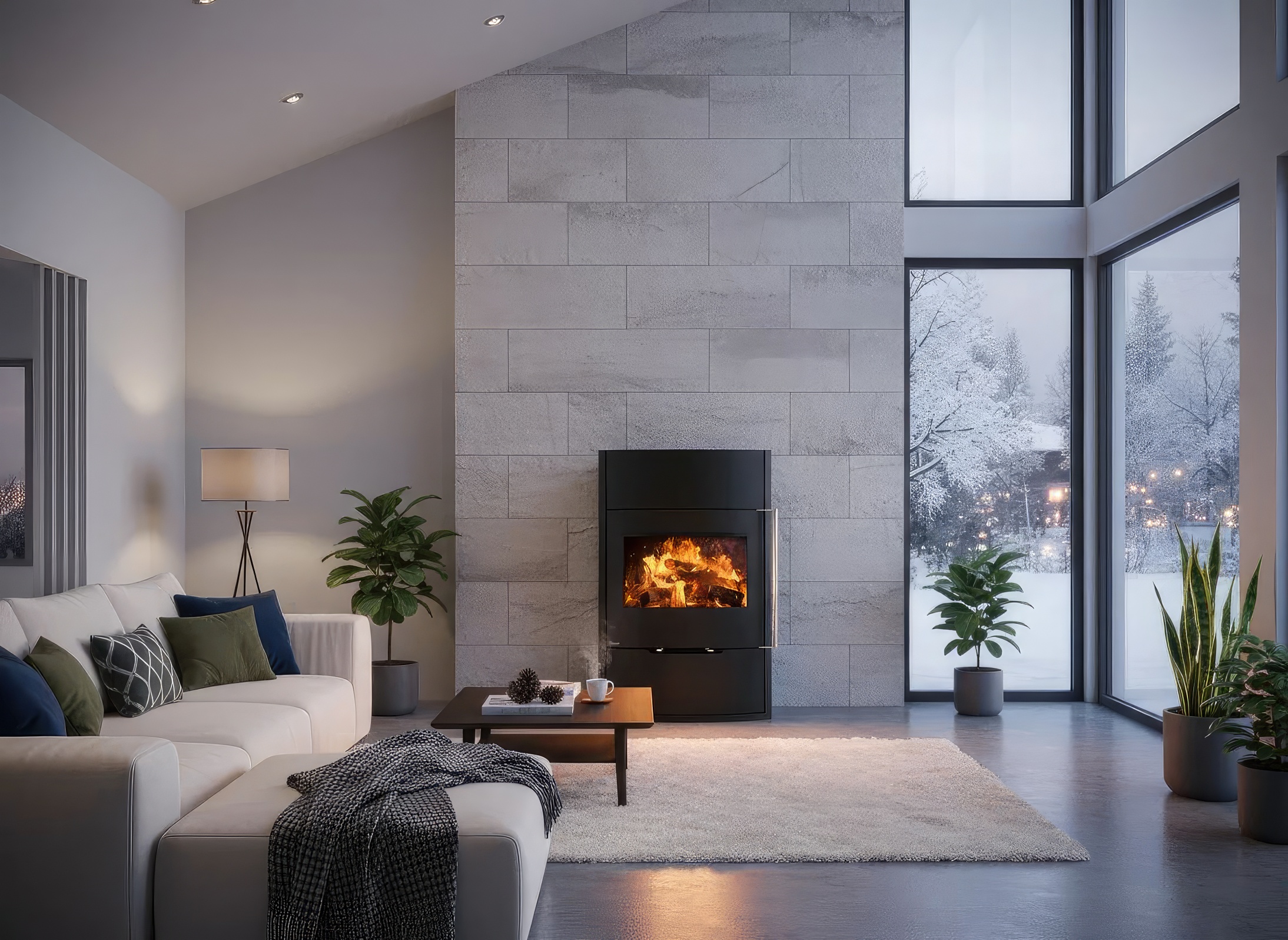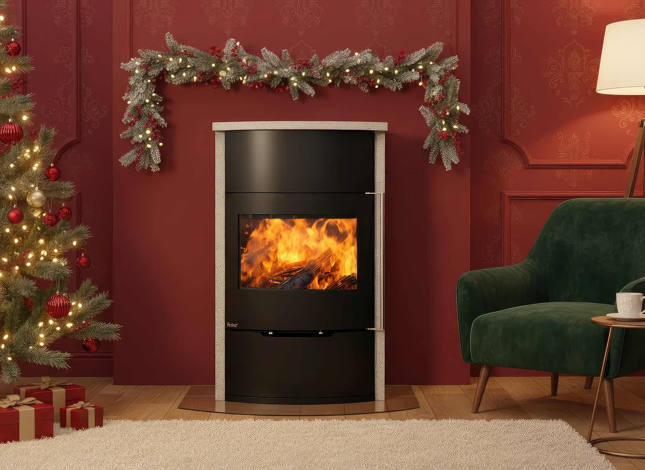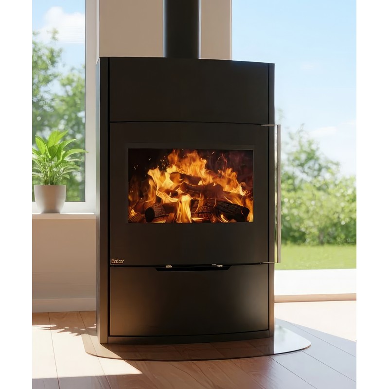 - Обзор 90 градусов: Угловое стекло Full Glass с черной шелкографией создает панорамный вид, визуально расширяя пространство топочной камеры.