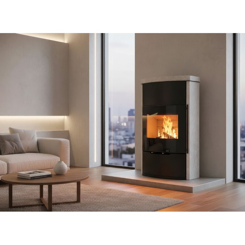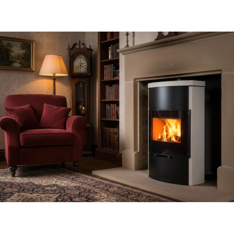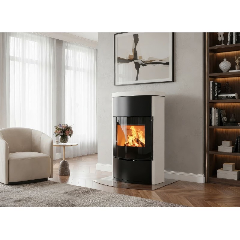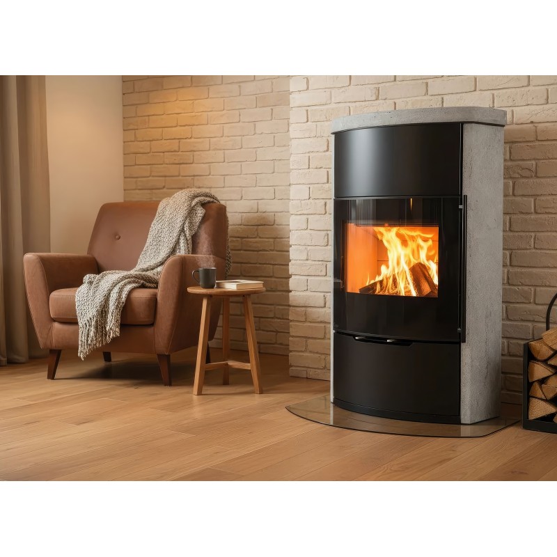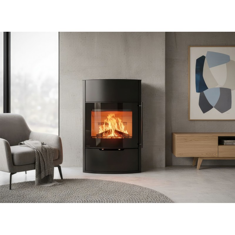 Несмотря на изящную форму, модель обладает мощностью 7 кВт и способна обогреть до 70 м². Внутренняя камера футерована светлым вермикулитом, который отражает тепло, повышая эффективность горения и подчеркивая яркость пламени. Корпус выполнен из высококачественной котловой стали с термостойким покрытием.