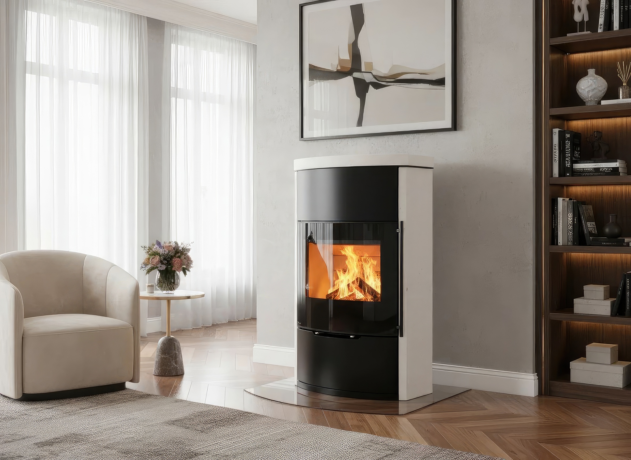 Печь-камин Ember O2 FG — это воплощение архитектурного минимализма. Главная особенность модели — Г-образное безрамочное стекло (Full Glass), которое в сочетании с настенным монтажом превращает камин в живую инсталляцию. Отсутствие ножек или основания освобождает пространство пола, делая интерьер визуально более легким и современным.