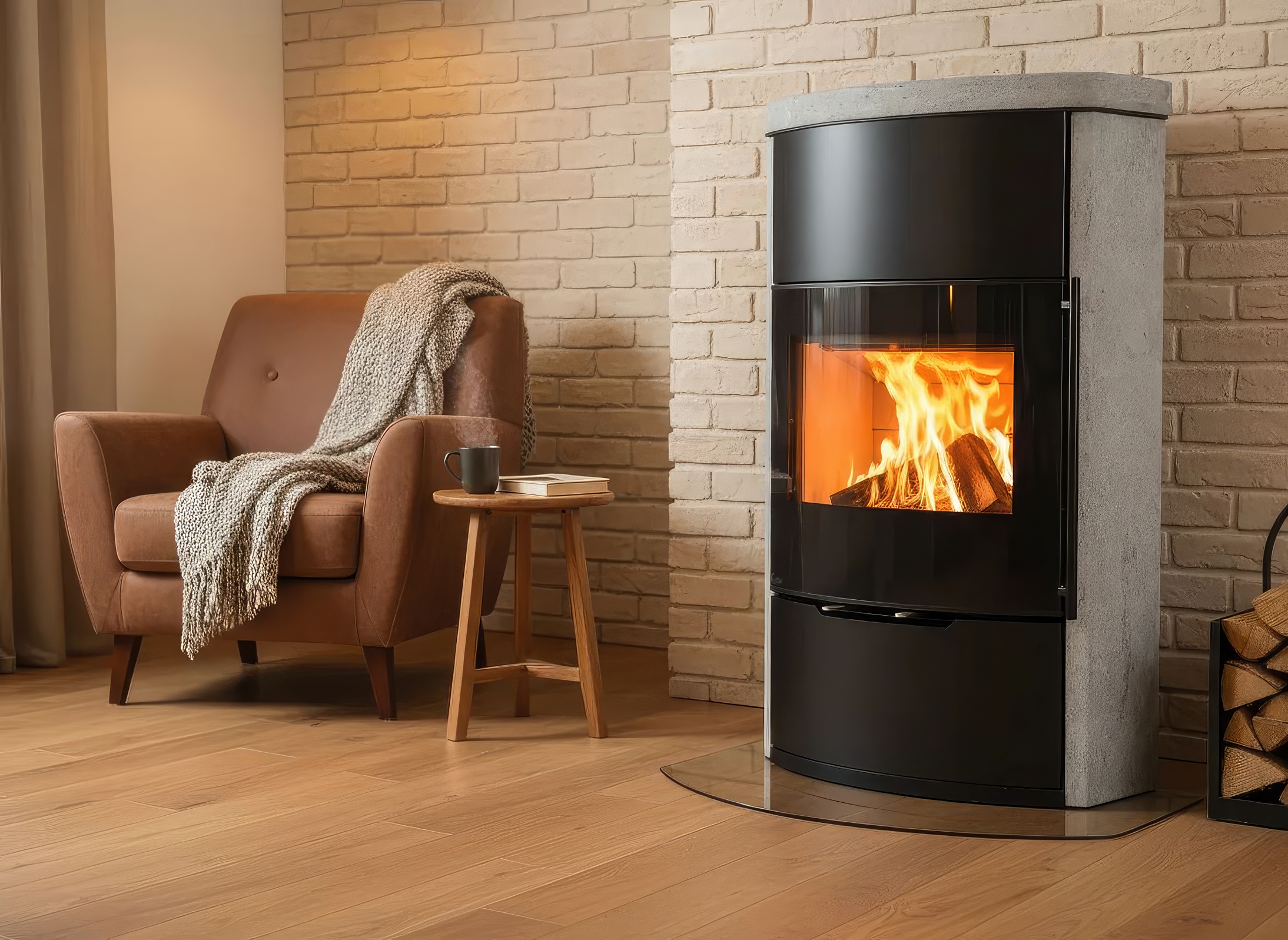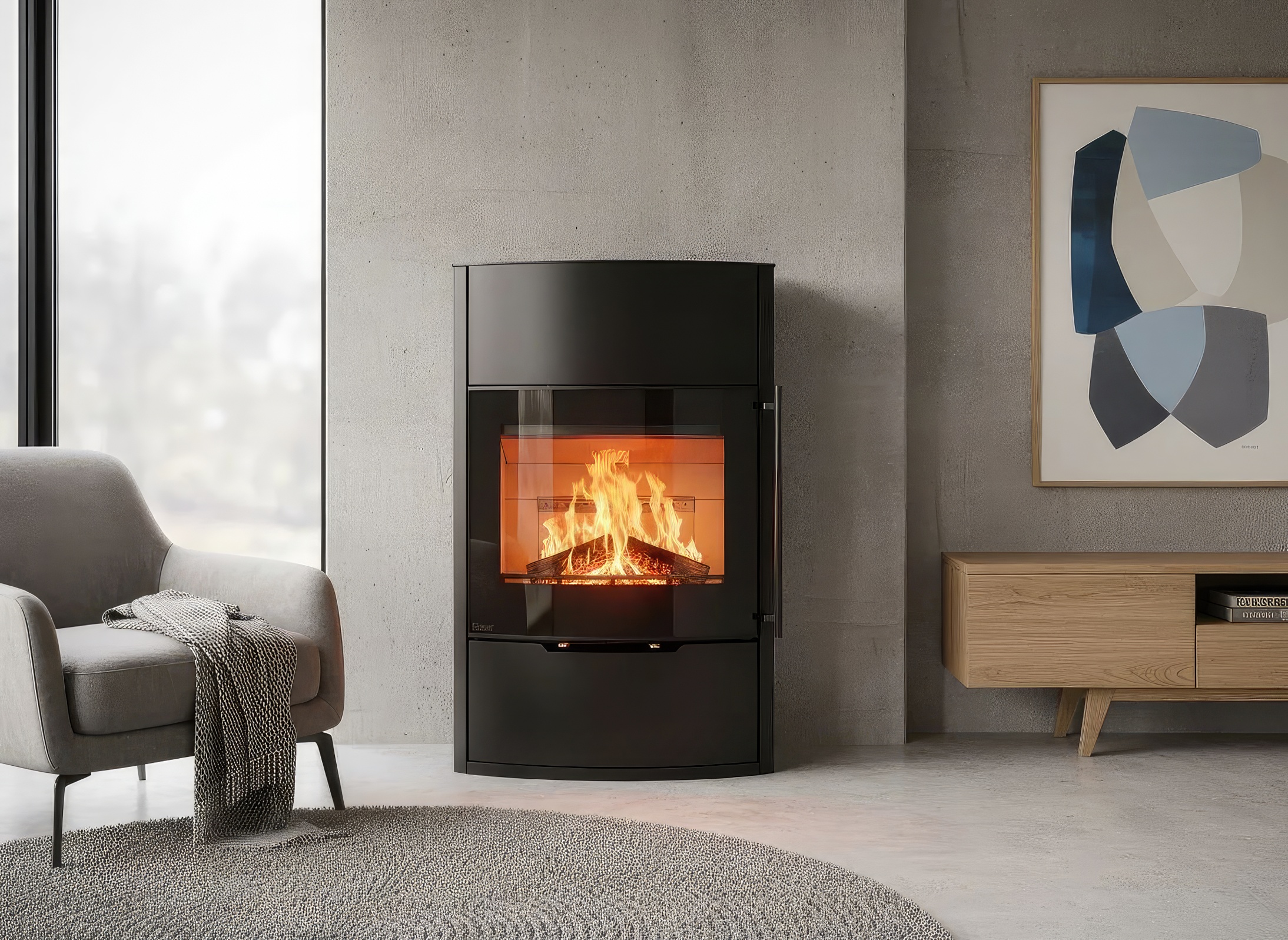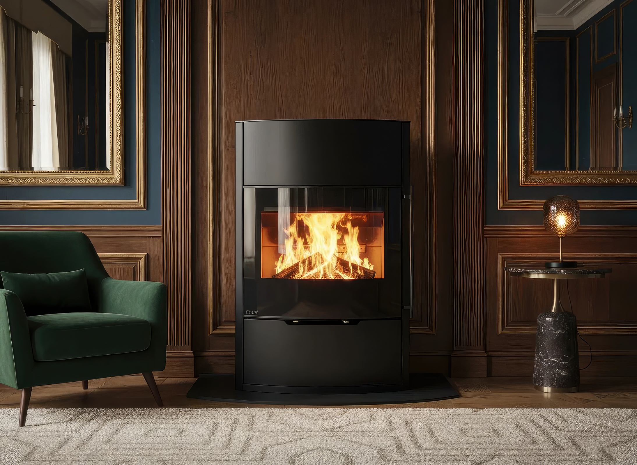 - Обзор пламени 90°: Цельностеклянный фасад без видимых металлических стыков позволяет наблюдать за огнем с двух разных ракурсов одновременно.