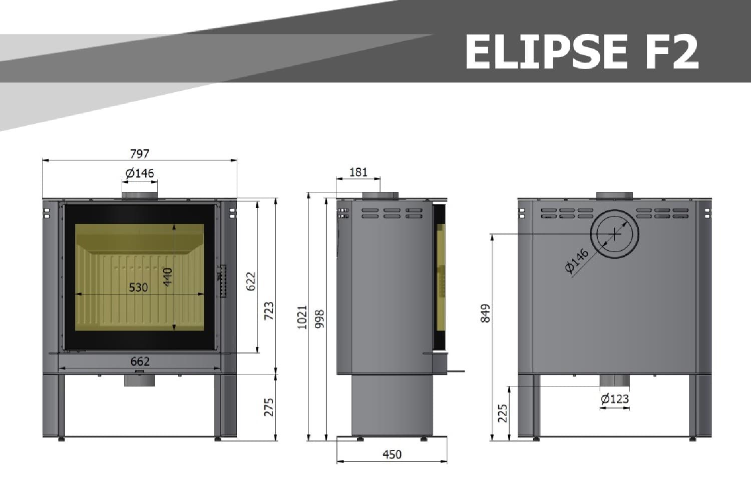 Печь-камин ELIPSE имеет закрытую камеру сгорания, облицованную накопительной керамикой, со съемной чугунной решеткой и зольником. Соединитель воздухозаборника обеспечивает постоянный доступ воздуха для горения, поэтому позволяет устанавливать печь в домах с механической вентиляцией или рекуперацией. Система разнонаправленной аэрации топлива и конструкция тройного отклонения дымовых газов обеспечивают идеальное сгорание и экономичность на самом высоком уровне. Эргономичный регулятор позволяет управлять мощностью устройства в пять ступеней, а вентилируемая ручка рукоятки с замком типа «Клик» повышает комфорт использования. Все модели ELIPSE предлагают возможность установки дымоотвода в двух плоскостях - вертикально вверх или горизонтально на задней стенке печи.