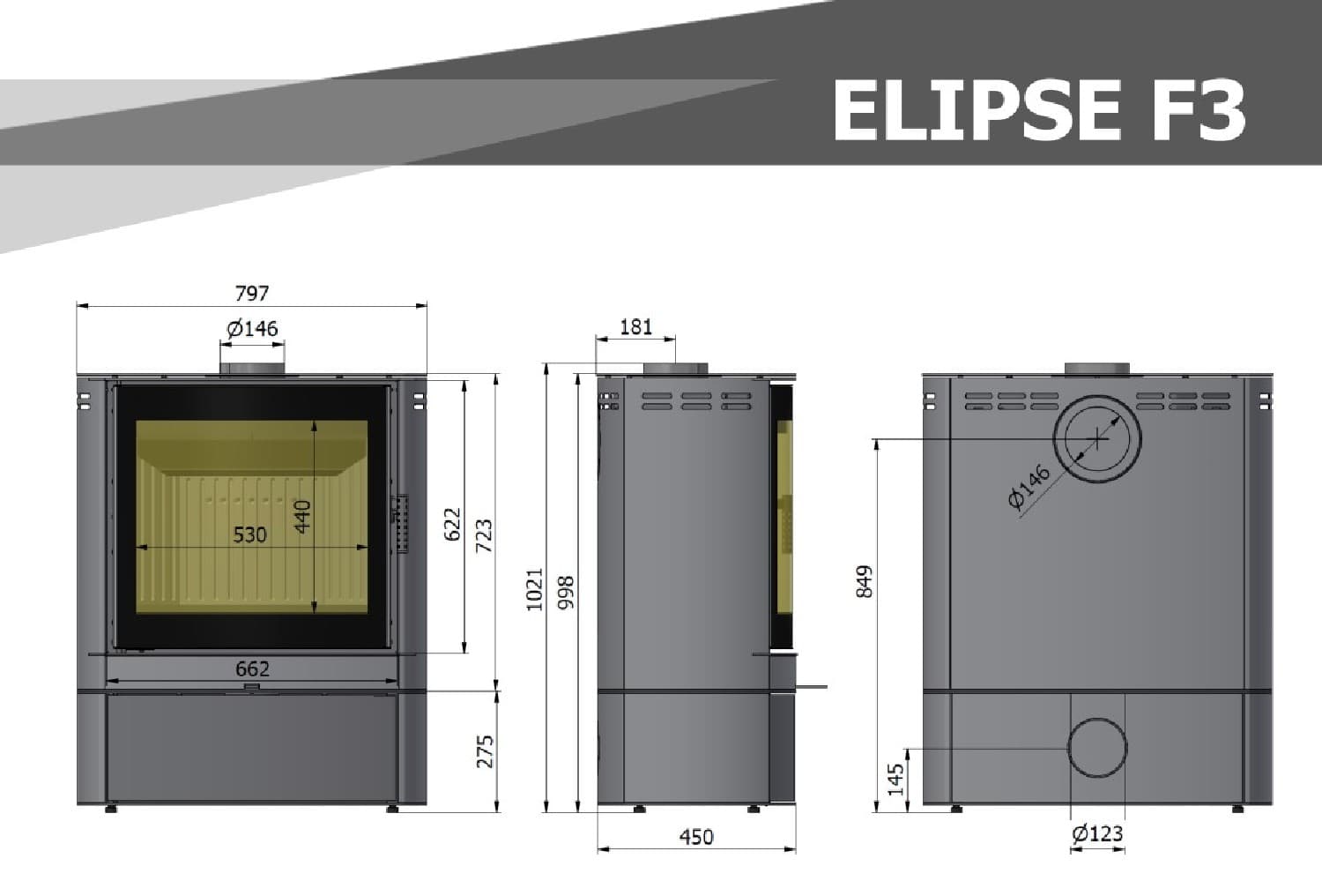 Печь-камин ELIPSE имеет закрытую камеру сгорания, облицованную накопительной керамикой, со съемной чугунной решеткой и зольником. Соединитель воздухозаборника обеспечивает постоянный доступ воздуха для горения, поэтому позволяет устанавливать печь в домах с механической вентиляцией или рекуперацией. Система разнонаправленной аэрации топлива и конструкция тройного отклонения дымовых газов обеспечивают идеальное сгорание и экономичность на самом высоком уровне. Эргономичный регулятор позволяет управлять мощностью устройства в пять ступеней, а вентилируемая ручка рукоятки с замком типа «Клик» повышает комфорт использования. Все модели ELIPSE предлагают возможность установки дымоотвода в двух плоскостях - вертикально вверх или горизонтально на задней стенке печи.