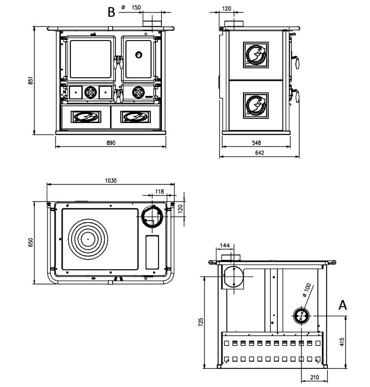 Топочная камера из чугуна • Внешняя облицовка натуральным камнем или майоликой • Дверцы и верхняя варочная панель из эмалированного чугуна • Стеклокерамика, устойчивая к высоким температурам до +750°