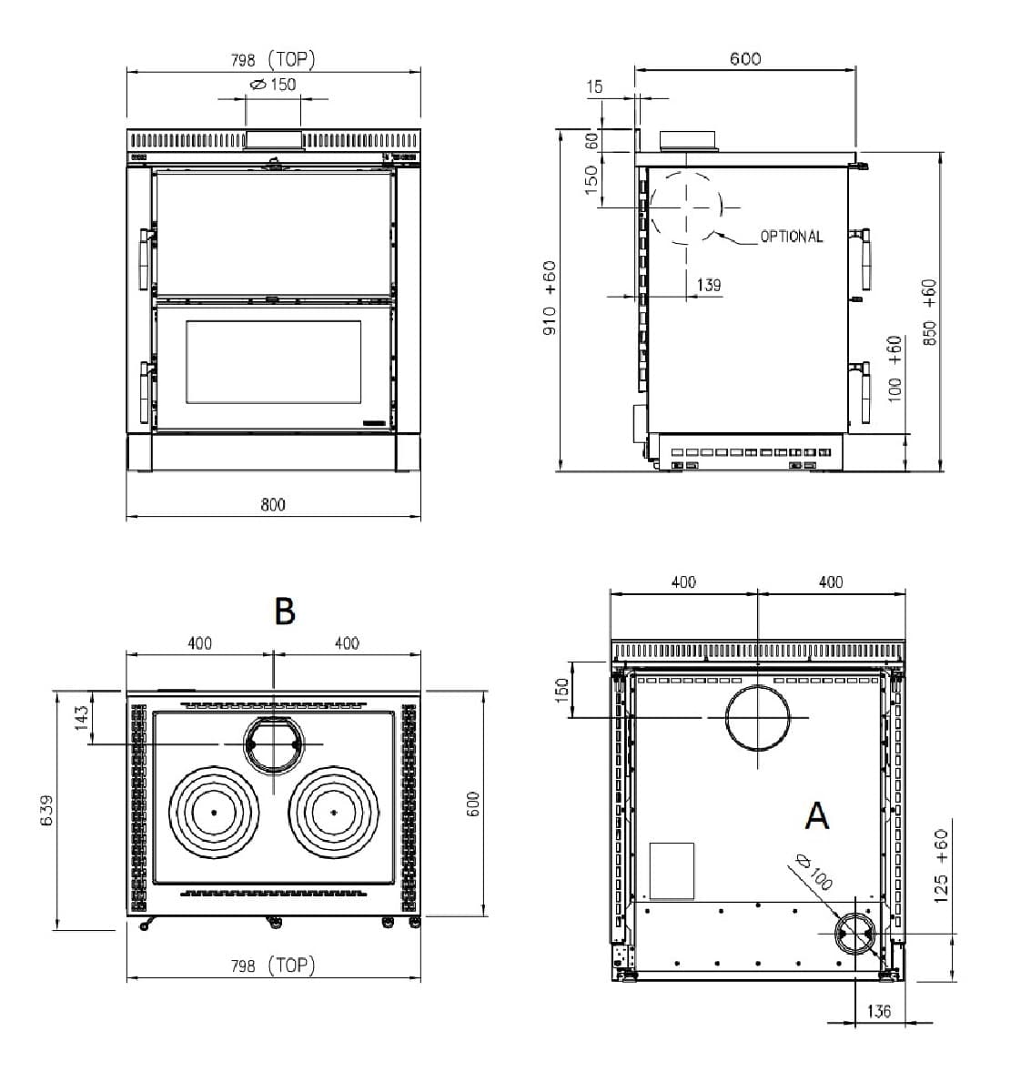- Чугунная дверца топки с внутренним каналом воздуха для горения для обеспечения лучшей очистки и долговечности стеклокерамики