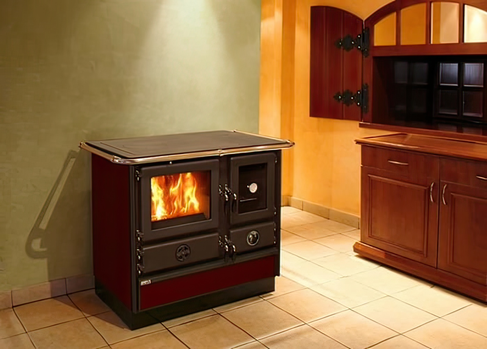 бордовый и черный. Печь укомплектована большой чугунной варочной