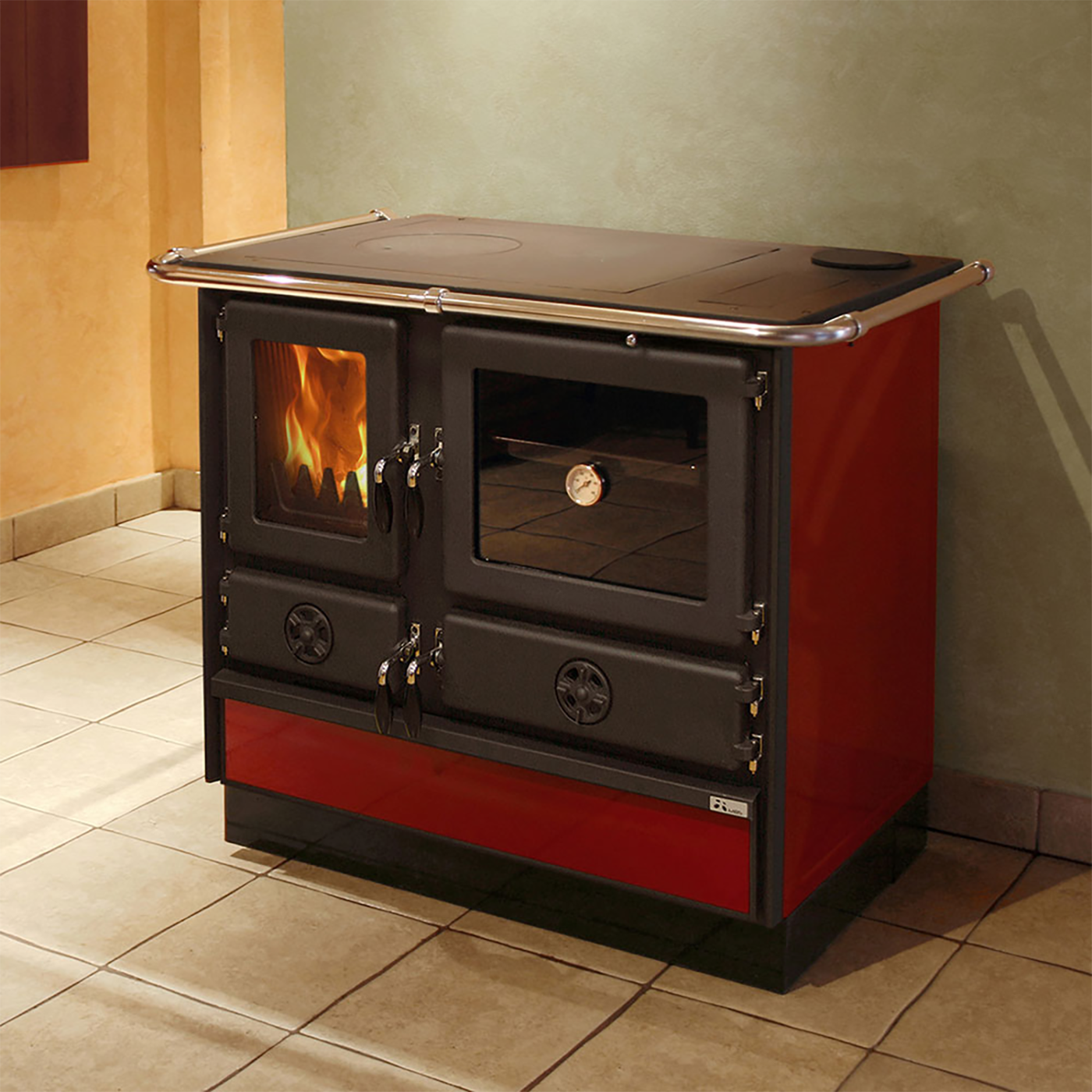 Дровяной камин предназначен для отопления загородных домов и приготовления пищи. Печь изготовлена из чугуна и эмалированной стали. Эмалированное покрытие обеспечивает продолжительный срок службы печи и отвечает за эстетичный внешний вид. Доступно четыре цвета эмалированного покрытия: красный, кремовый, бордовый и черный. Печь укомплектована большой чугунной варочной поверхностью с одной конфоркой и стальным эмалированным духовым шкафом для приготовления пищи. Духовой шкаф габаритами ВхШхГ, мм - 265х350х465 оснащён протвенем и датчиком температуры. Для подключения к системе водяного отопления используется теплообменник-змеевик объёмом 11 л и мощностью 8.5 кВт.