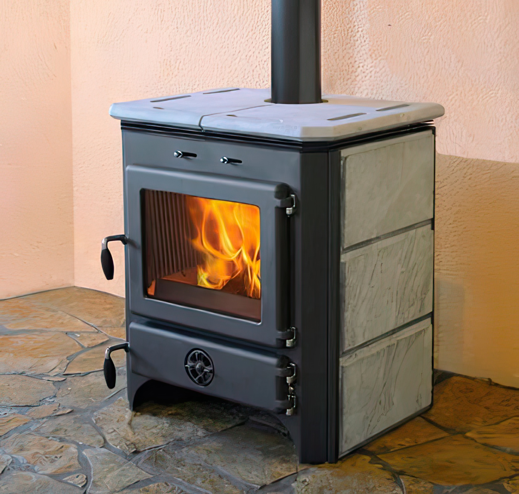 чугунной поверхности печи. Печь-камин MBS VULKAN S с камнем можно купить нашем в магазине по недорогой цене.