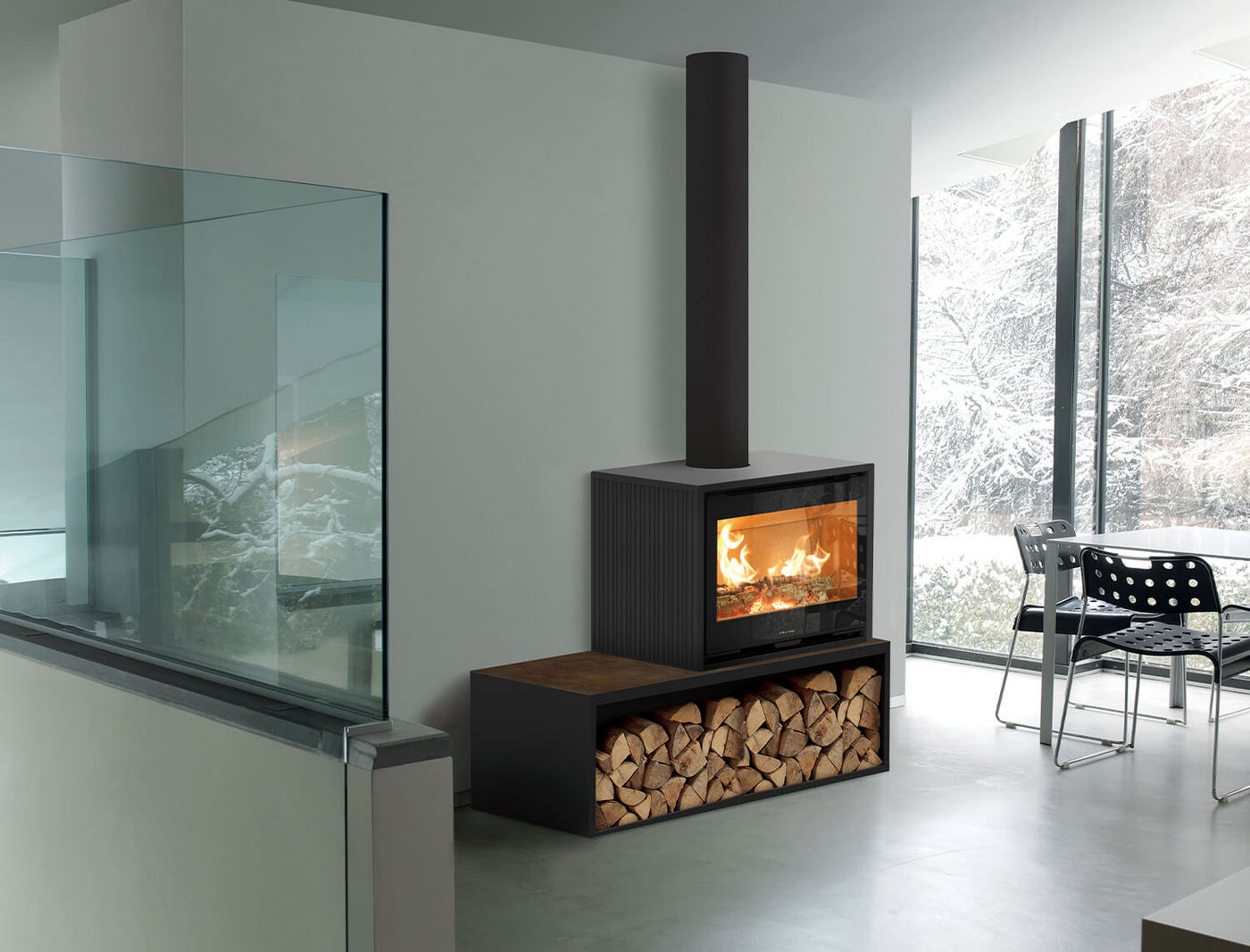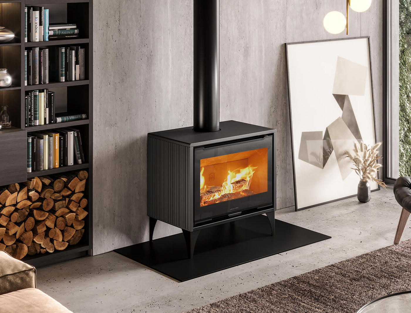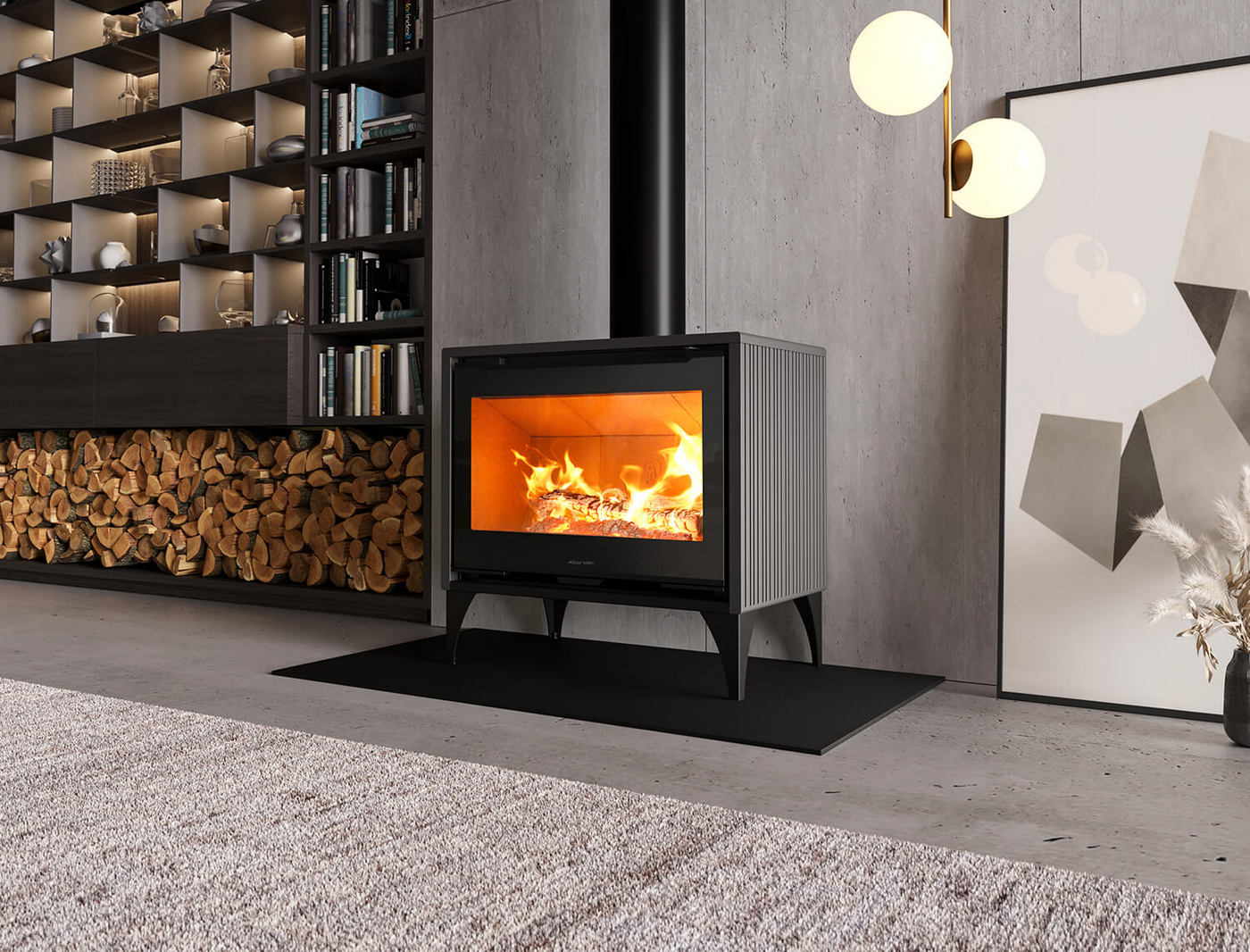 Керамическая облицовка QUADRO+ в размере 80 см может быть использована как напольное покрытие для печи, установленной на регулируемых ножках, либо как часть стоячей печи с интегрированной подставкой для дров, выполненной из керамогранита премиум-класса.