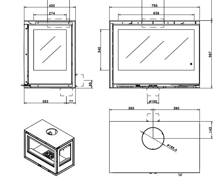 Печь идет с дополнительным стеклом слева или справа, что улучшает обзор пламени. Стекло изготовлено из огнестойкой стеклокерамики и выдерживает высокие температуры.