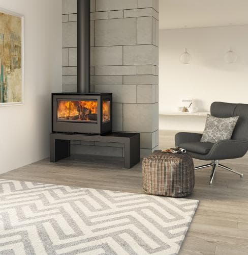 Камин доступен в виде отдельно стоящей печи, которую можно установить непосредственно в очаг или поднять с пола и установить на подставку Rocal (продается отдельно) для еще более современного вида.