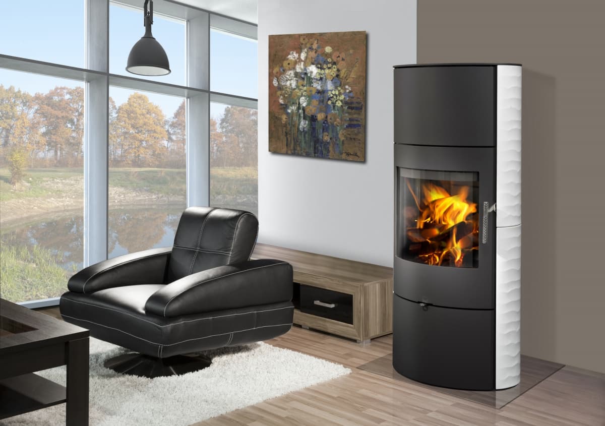 Умелое сочетание основных размеров теплоаккумулирующих печей способствовало возникновению уникального дизайна. Закругленное стекло специальных размеров создает крупноформатную картину пламени.