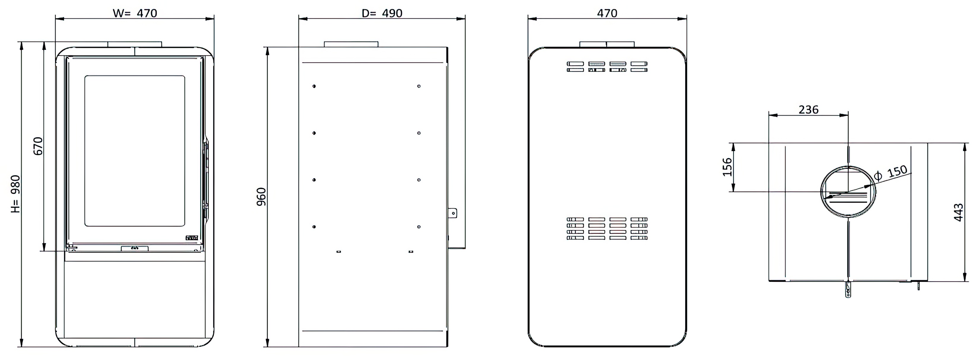 Диаметр дымохода: 150 мм.