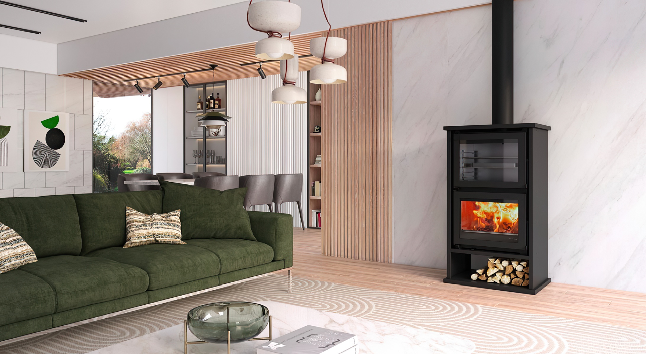 Solzaima M12F Eco - печь M12F Eco Solzaima известна своей привлекательной эстетикой, наличием дровяной топки и духовки.