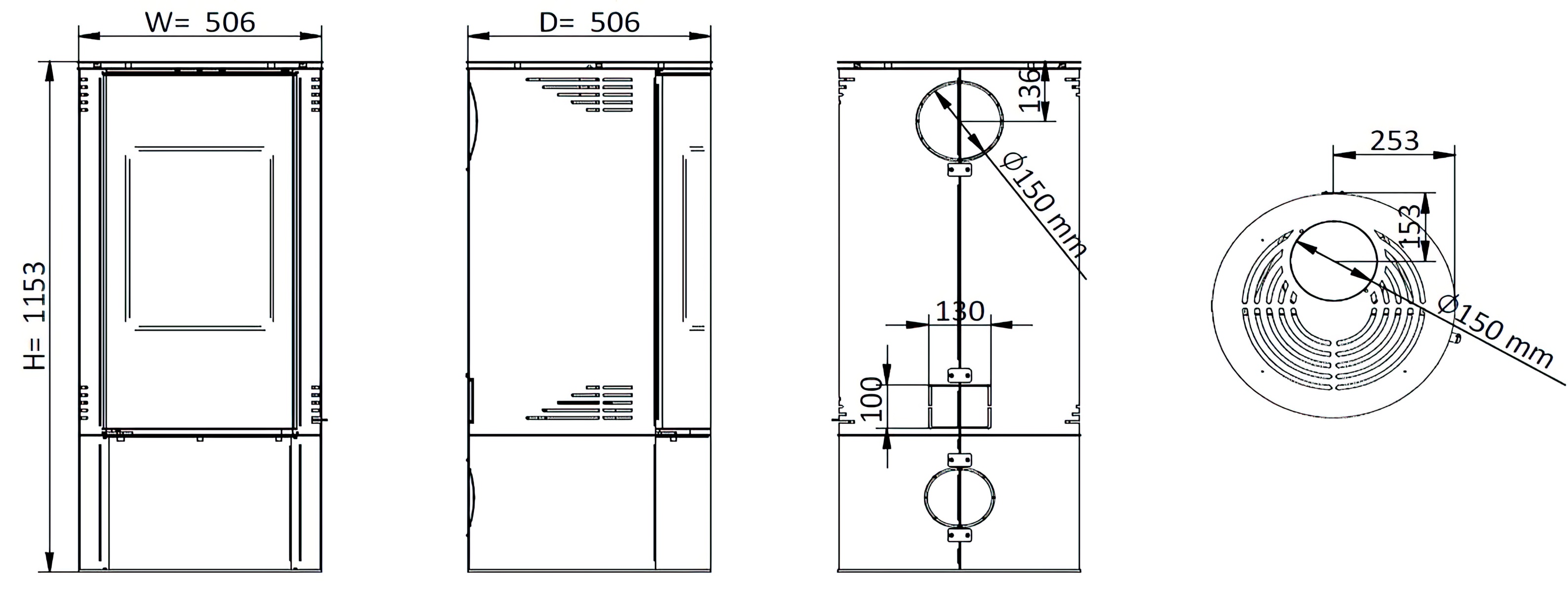 Диаметр дымохода: 150 мм.