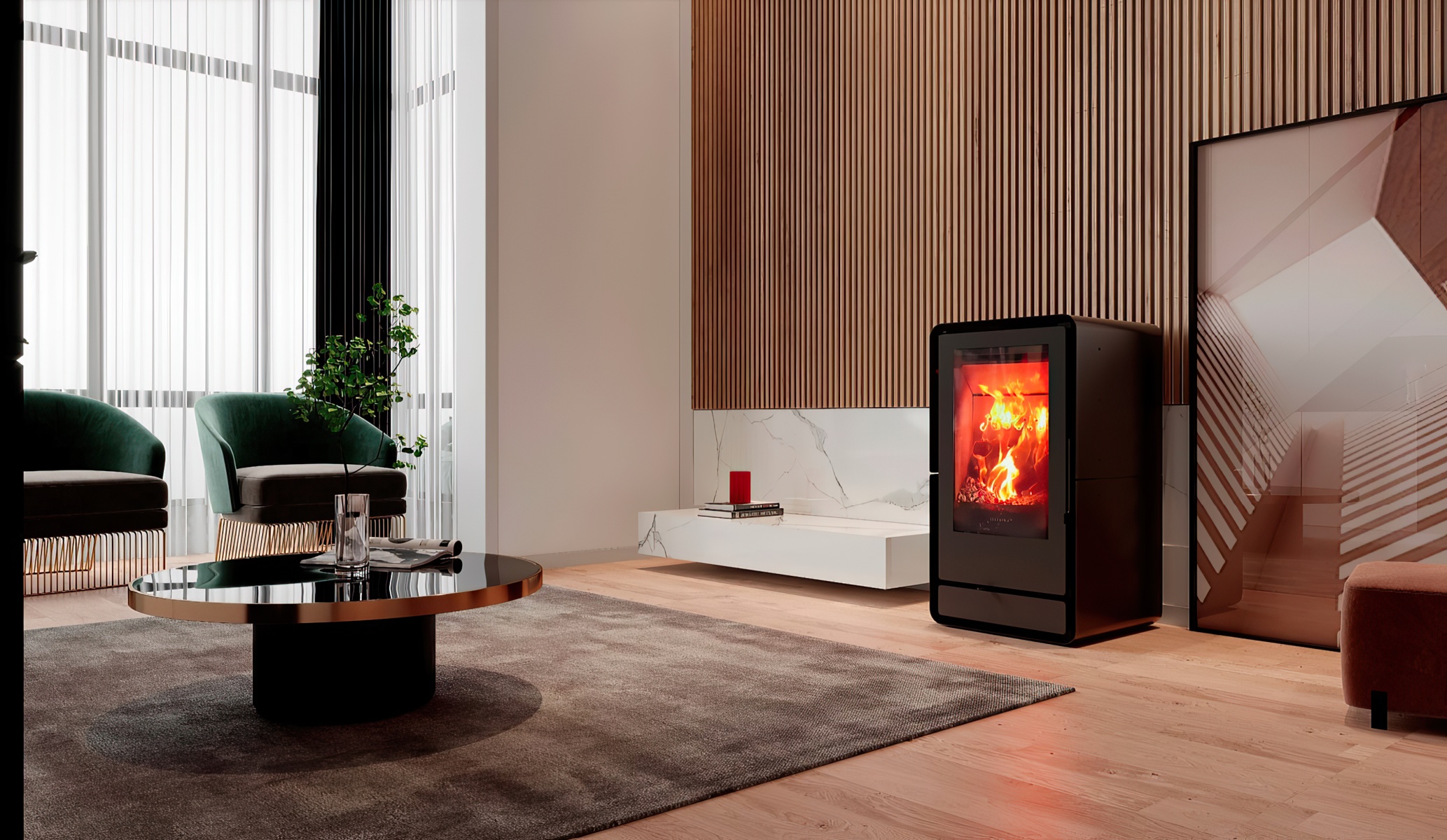 Solzaima Tec Round Eco - печь, имеющая cовременный стильный дизайн, благодаря которому она с легкостью интегрируется в любое помещение и украшает его.