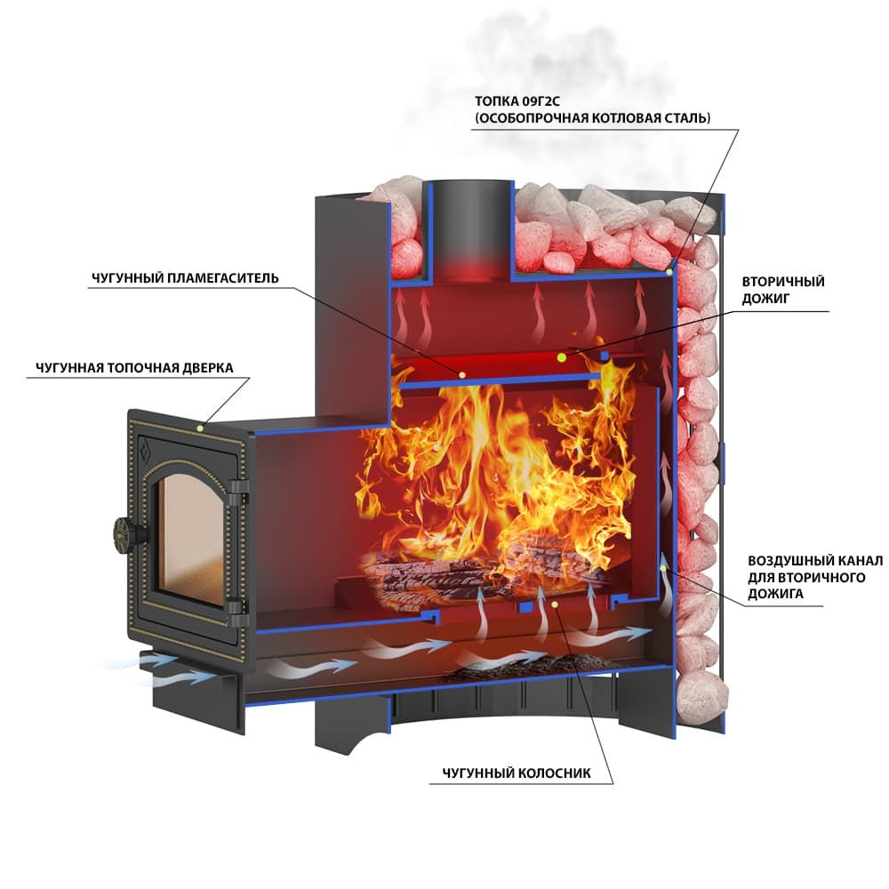 Печь изготовлена из особо прочной котловой стали 09Г2С, рассчитанной на работу при высоких температурах и давлении. Толщина стенок печи 4-6 мм. Топочный тоннель также выполнен из стали марки 09Г2С толщиной 4 мм, и позволяет использовать дрова длиной более 50 см.Топка оснащена каналом для подачи воздуха на вторичный дожиг дымовых газов. Канал проходит по задней стенке топки снизу вверх и подаёт воздух для горения в верхние отделы топки. Такая конструкция повышает экономичность печи и увеличивает КПД агрегата.Съёмный чугунный колосник в сочетании со скошенными краями боковой части стенки облегчает уход за топкой, уборку золы и несгоревших углей.Воздух в зону горения подаётся через поддувало, спереди закрытое дверью печи.Стальная дверь изготовлена из особо прочной стали толщиной 2 мм, оборудована термостойким стеклом и выдерживает температуру до 650 градусов.Подача воздуха для колосникового горения происходит через нижние отверстия двери. Интенсивность горения регулируют закрытием заслонки на отверстиях.Верхний ряд отверстий подаёт воздух на стекло и отсекает дымовые газы от дверки. Так обеспечивается чистота стекла во время топки и отсутствие сажи на внутренних поверхностях дверки.Чугунный пламегаситель перенаправляет поток горячего воздуха и дымовых газов к задней части топки. Это позволяет снять с печи максимум энергии в единицу времени. Печи Везувий СКИФ оснащаются сеткой для камней. Сетка сделана из кованой стальной ленты шириной 40 мм. В сетку по всей высоте укладываются камни для бани, обеспечивая большой объём заклада и длительное удержание тепла после прогрева каменки.