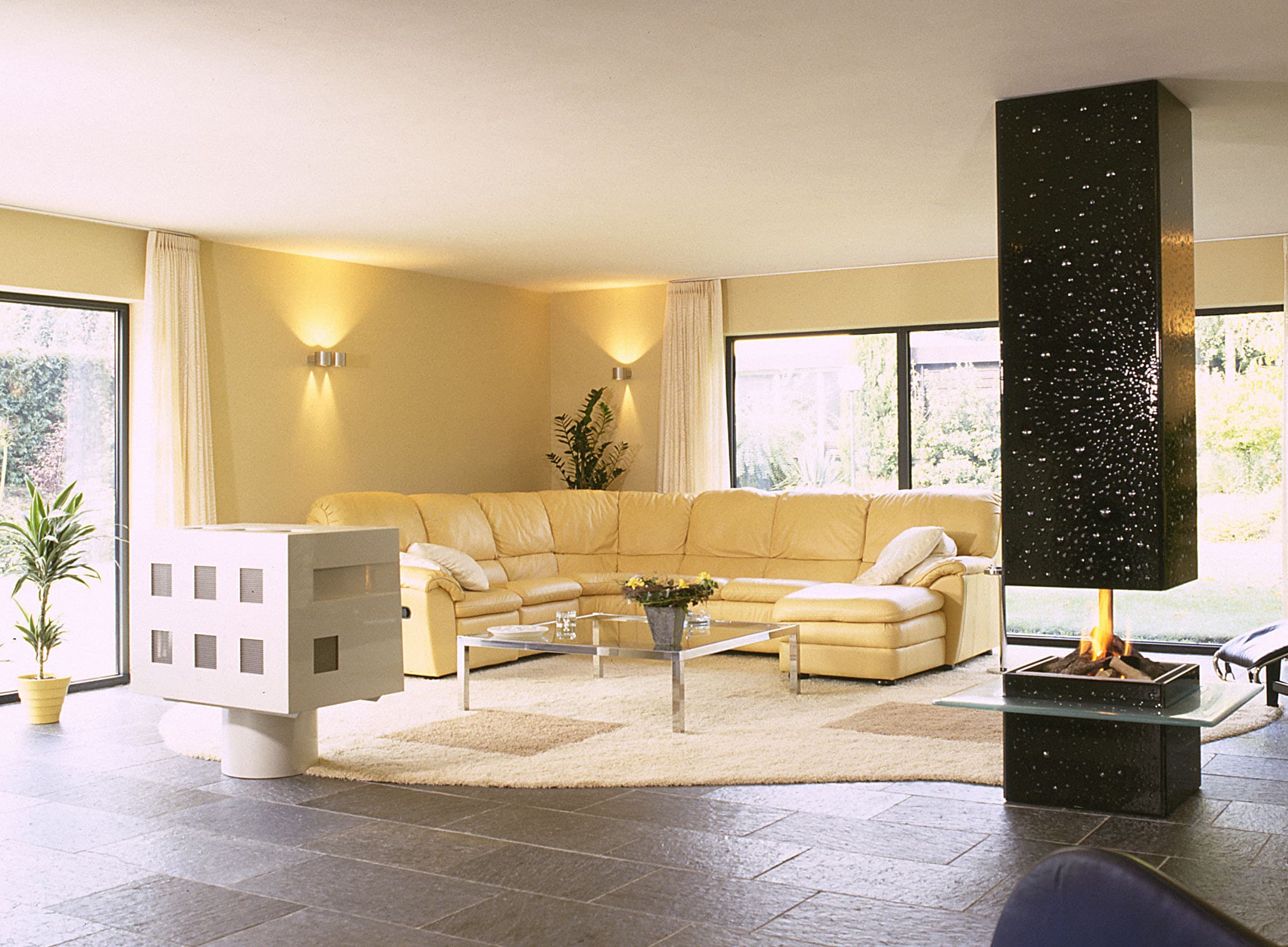 Изготовленный на заказ подвесной камин в центре большой гостиной. Работает на газе (также может быть дровяной или этаноловой).