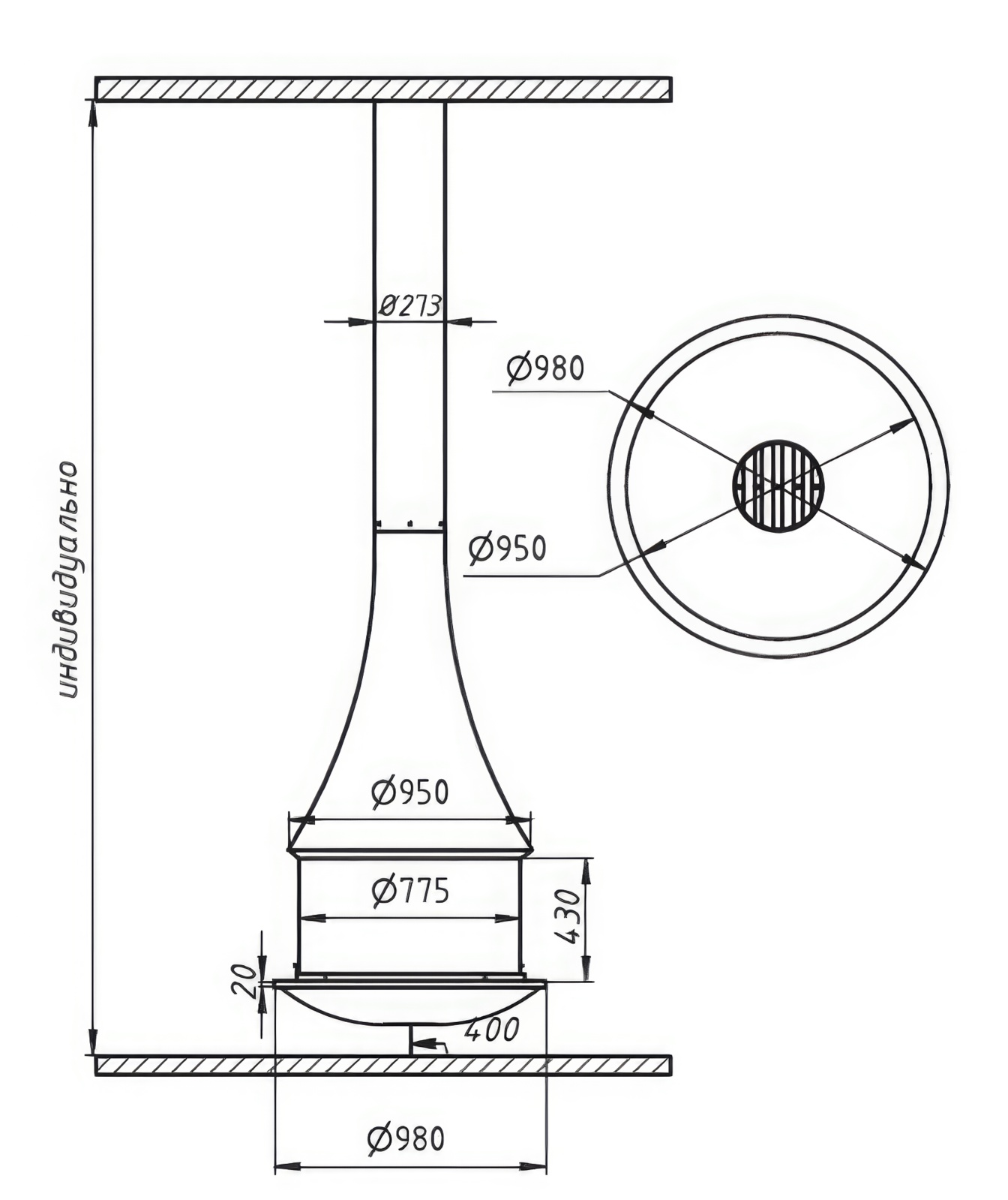 Элегантный корпус выполнен из прочной стали и покрыт термостойкой краской. Камин подвешивается к потолку, создавая эффект парения и архитектурной лёгкости. Подходит для использования с электрокамином или биотопливной топкой, не требует дополнительной отделки и легко интегрируется в интерьеры в стиле минимализм, хай-тек, сканди.