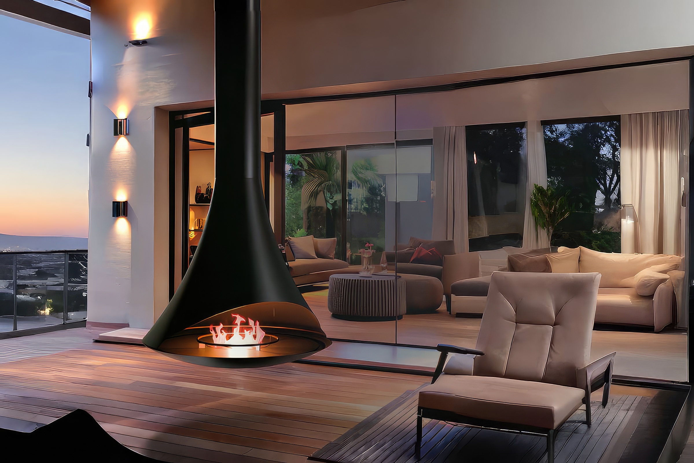 Камин AVES 26 КОМО — это эффектный подвесной дровяной камин с открытым очагом, выполненный в каплевидной форме. Его уникальная конструкция позволяет разместить камин в центре каминного зала или со смещением — в определённой зоне гостиной. Благодаря подвесному монтажу, модель создаёт визуальный эффект парения, превращая огонь в архитектурный акцент.