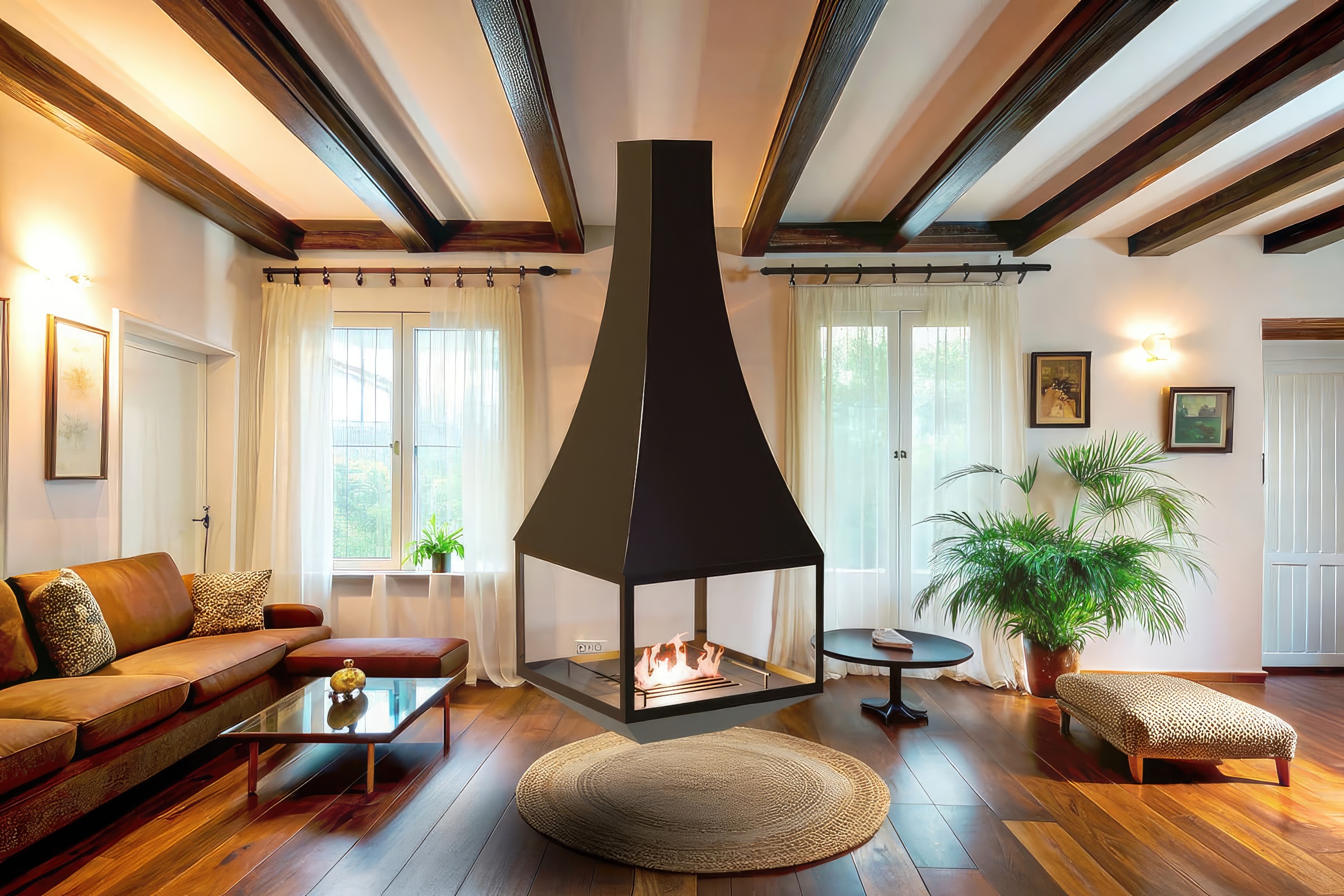 Камин AVES 6 ПРАТО — это стильный подвесной камин с панорамным остеклением, который превращает огонь в архитектурный элемент интерьера. Благодаря уникальной конструкции, стеклянные панели крепятся к боковым рёбрам, создавая эффект полного обзора пламени с любой точки помещения. Нижняя часть корпуса визуально «парит» в воздухе, подчёркивая лёгкость и современность дизайна.