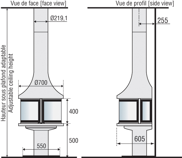 Стандартно камин имеет высоту 2,5 метра, при необходимости ее можно увеличить при помощи дополнительных труб.