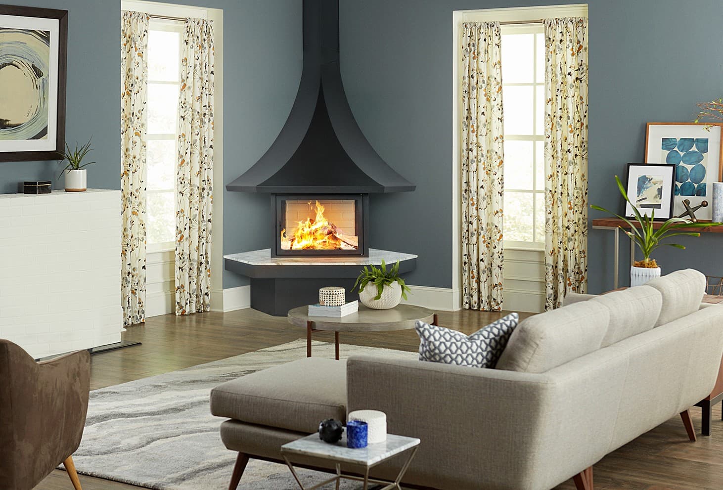 - Информация:Пристенный угловой камин с трехсторонним остеклением