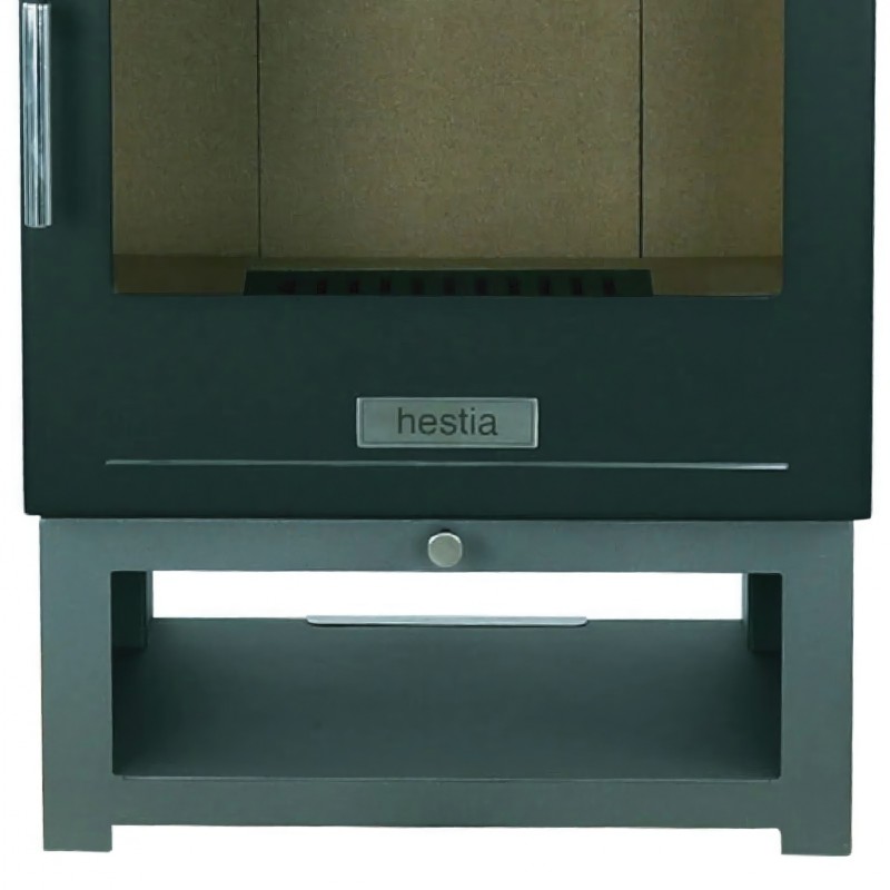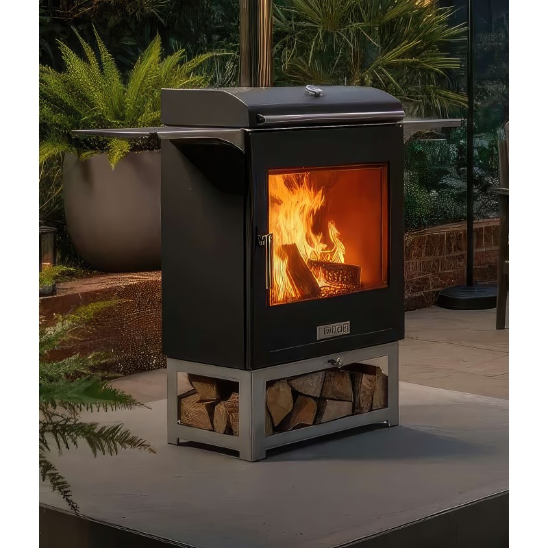 Печь изготовлена из высококачественной котловой стали, усиленной внутренними вермикулитовыми плитами. Это не только защищает корпус от прогорания, но и поддерживает высокую температуру в топке, способствуя самоочистке стекла. Нижняя часть печи дополнена удобной открытой нишей для хранения и просушки дров.