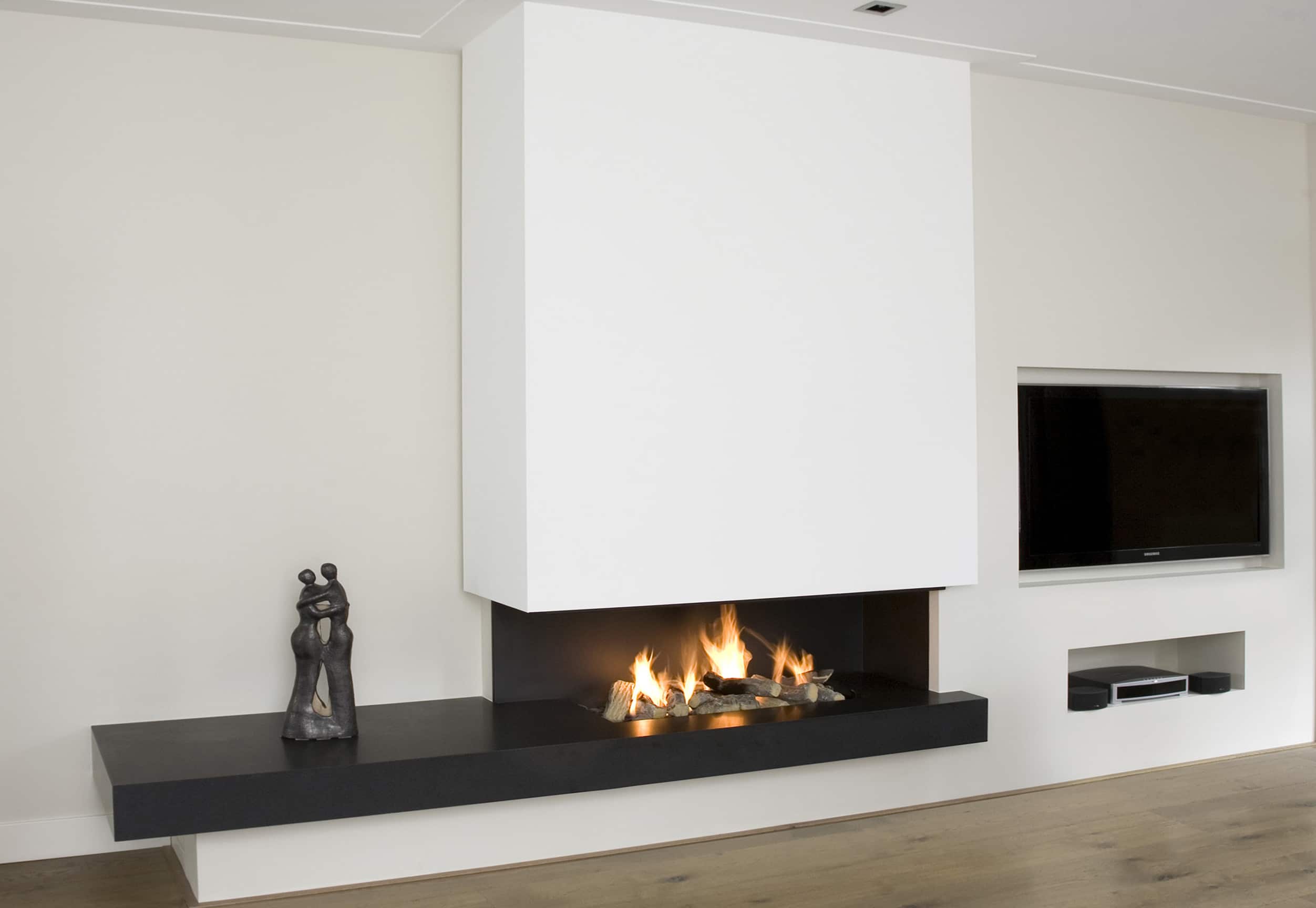 Роскошный, сделанный на заказ, камин у стены с экраном для телевизора. Колпак дымохода изготовлен из белой лакированной стали. Основание имеет смещенное от центра расширенное плато.