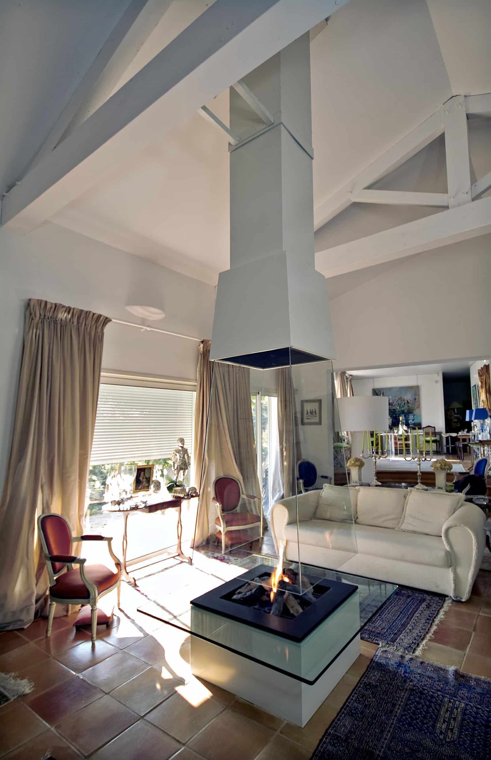 Это современный пирамидальный камин, расположенный под очень высоким потолком.