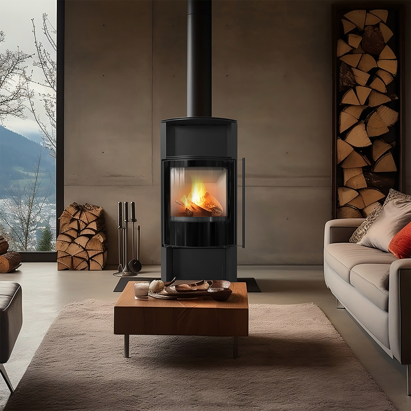 TOFA оснащена стеклянной дверцей с эстетичным черным декором, что придает ей элегантный внешний вид. Для открывания дверцы предусмотрена удобная ручка в виде поручня. Это печь, которая не только обеспечивает комфорт и безопасность, но и отличается современным дизайном, идеально вписывающимся в самые разные интерьеры.