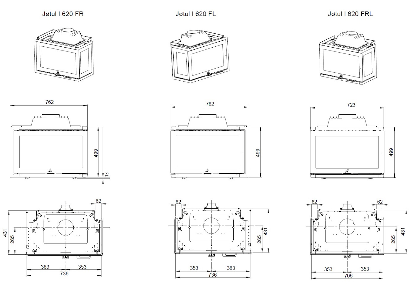 Каминная топка Jotul i620 FL состоит из серии моделей: две угловые топки (правую и левую) и центральную топку с тремя стеклянными стенками. Стеклянные стенки камина изготовлены с использованием специального материала, который обладает отражающими свойствами. Этот материал помогает предотвратить накопление сажи, оптимизировать процесс сгорания и тем самым улучшает общую эффективность работы камина.