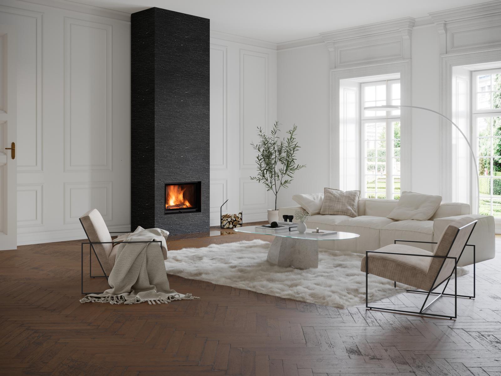 Новая шамотная облицовка не только выглядит более гладкой и современной, она еще и модульная. Это снижает стоимость запасных частей, если в какой-то момент потребуется заменить внутреннюю обшивку. Мелкопористая поверхность также обеспечивает на 15% лучшую теплоизоляцию. Опционально доступна облицовка камеры сгорания черными литыми пластинами с рифленым видом, которые с обратной стороны изолированы вермикулитом толщиной 25 мм.