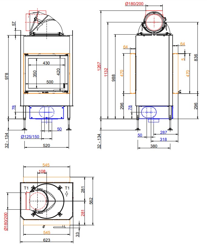 - Способ открытия дверцы топки:боковое открытие с двух сторон
