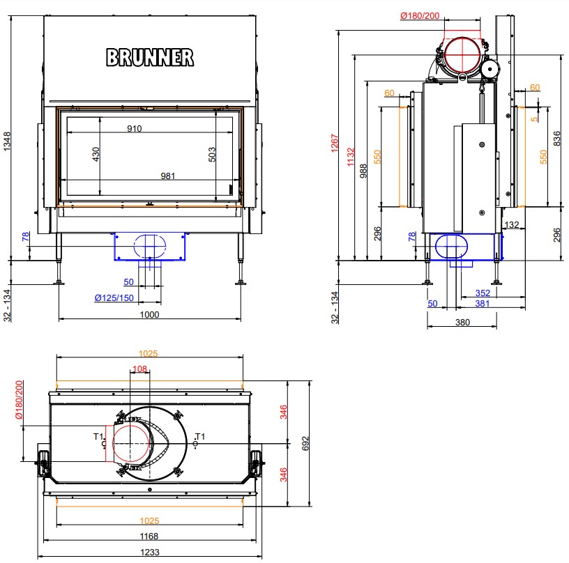 Brunner BKH 5.0 Tunnel 50-98 ST-KT - стальная туннельная топка с подъемным механизмом открывания дверцы с одной стороны и откидным с другой.