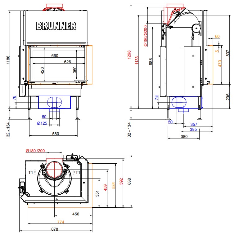 Brunner ECK BKH 42-66-42 STR - стальная угловая правосторонняя топка с подъемным механизмом открытия дверцы.