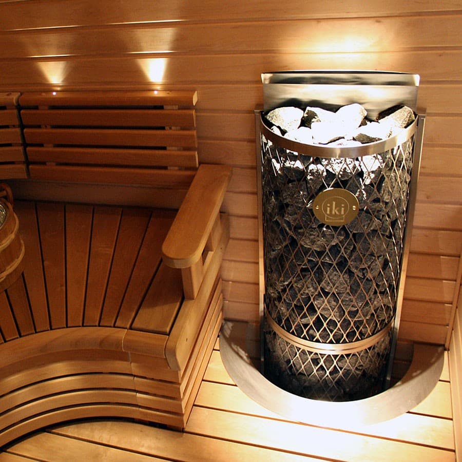 Эта электрическая печь IKI специально разработана для установки у стены. Спереди — традиционный отсек для камней, закрытый сеткой. Сзади — сплошная стальная пластина. Идеальна, когда в парилке немного доступного простраства. Печь можно дополнить защитным фланцем. Это позволит вмонтировать её в пол или полки.